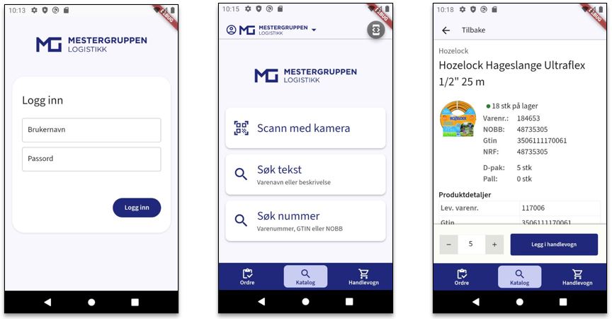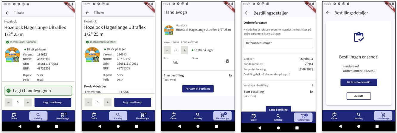 Ved treff får du opp en produktside med pakningsinformasjon, en velger for antall du skal bestille, samt knappen «Legg i handlevogn». Velg antall og legg produktet i handlevognen. Nå kan du scanne eller søke videre til du har fylt handlekurven med de varene du skal bestille. Merk at appen gir beskjed dersom du allerede har produktet i handlevognen eller om varen er restnotert.